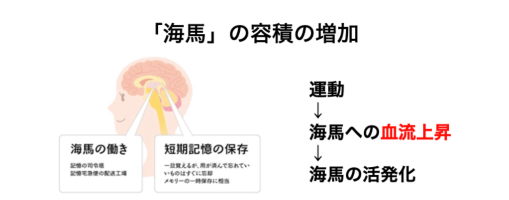 海馬とは「記憶の司令塔」と呼ばれており、運動をする事によって海馬へ流れる血流が増加します。